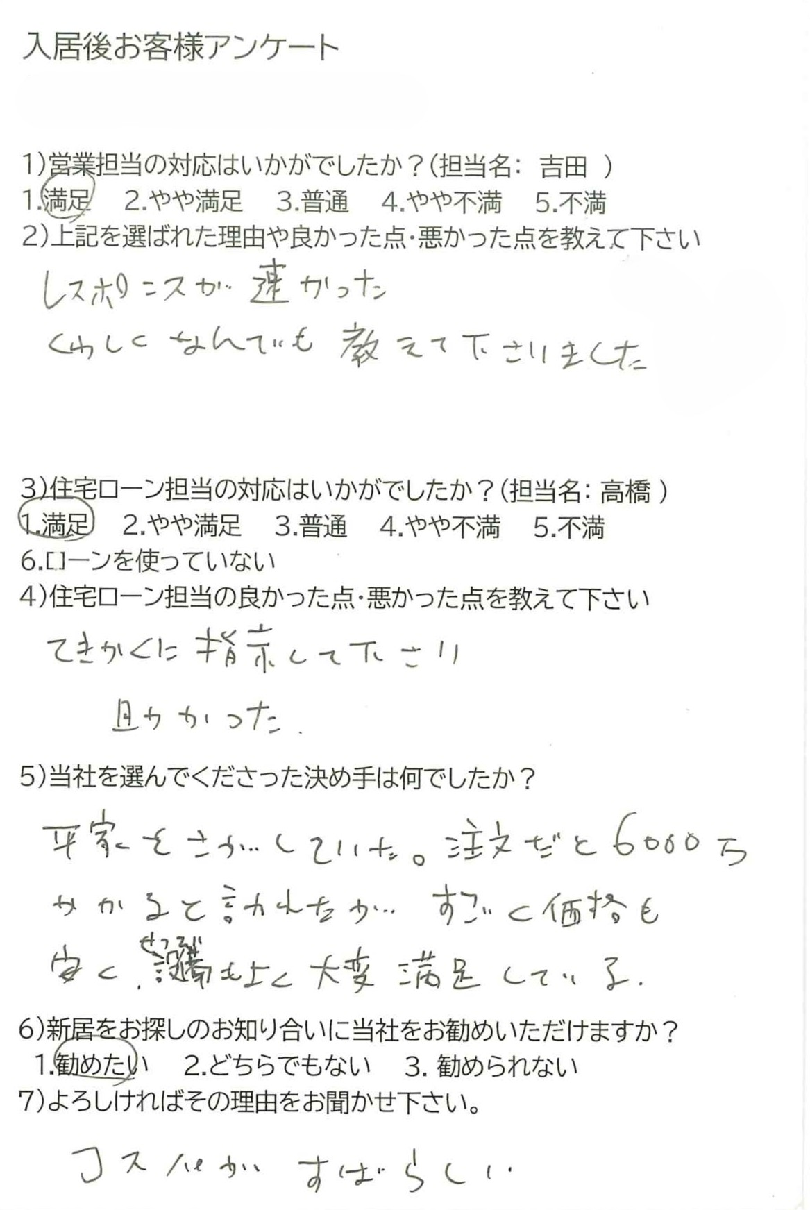 6)新居をお探しのお知り合いに当社をお勧めいただけますか?