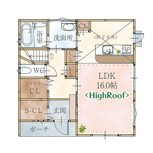 家族が集まるリビングは当社イチオシの「ハイルーフ天井高2m80cm」を採用。