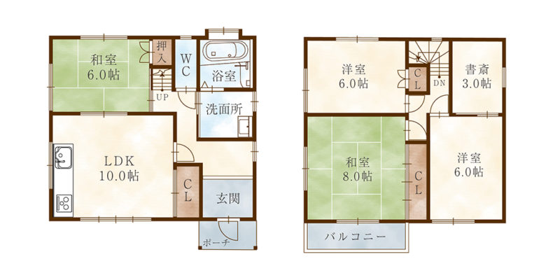 | 間取内容 | 洋室6.0畳 2階 2室 その他3.0畳 2階 和室6.0畳 1階 和室8.0畳 2階 LDK10.0畳 1階 | ||