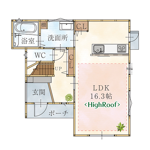 さらに、キッチン扉は明るい印象のホワイトスタッコを採用し、ウッド調の天井とも相性がよく