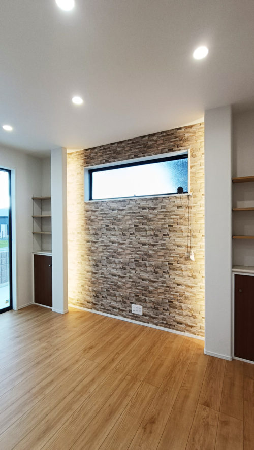 リビングにアンティーク風レンガ調のアクセントウォールを取り入れることで