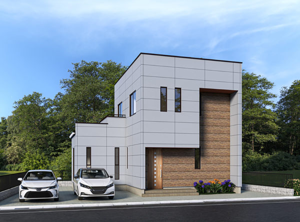 落ち着いたグレーの外壁をベースに、あたたかみのある木目調のサイデイングを組み合わせた外観です。