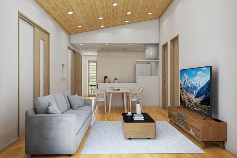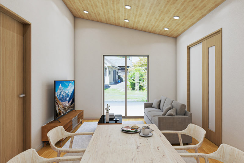 リビングは木目調の天井クロスで温かみのある空間に仕上げ、自然な木の風合いが日々の暮らしにやさしい雰囲気を添えます。