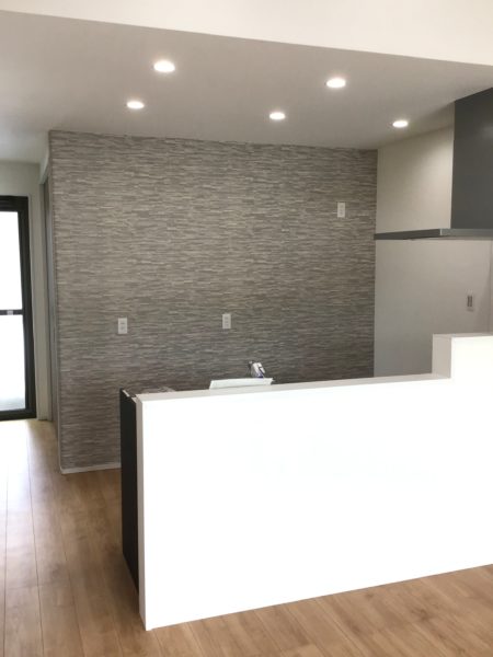対面キッチンは家族と会話を楽しみながら料理ができ、背面のクロスは柔らかい色合いで空間にさりげないアクセントをプラス。