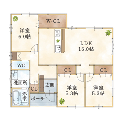 | 間取内容 | LDK16.0畳 1階 1室 洋室6.0畳 1階 1室 洋室5.3畳 1階 2室 | ||