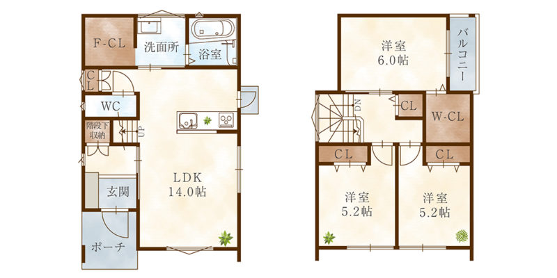 間取内容 LDK14.0畳 1階   洋室6.0畳 2階   洋室5.2畳 2階   洋室5.2畳 2階