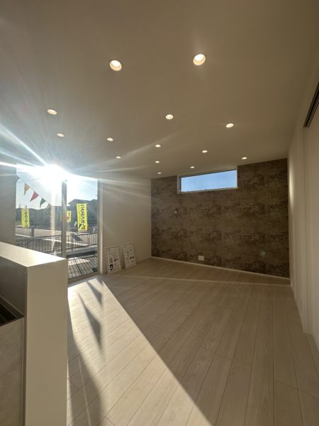 リビングにはシックなグレー系のタイル調のアクセントウォールを採用。