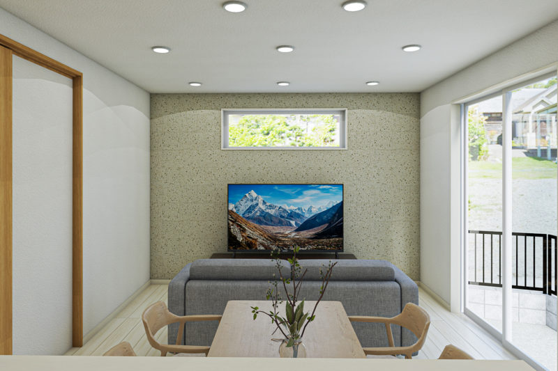 リビングのアクセントクロスには、グレーとベージュを合わせたような上品な色合いを採用。