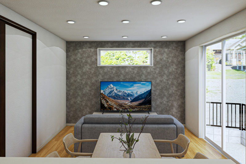リビングはグレー系の石目調デザインのアクセントウォールを採用。