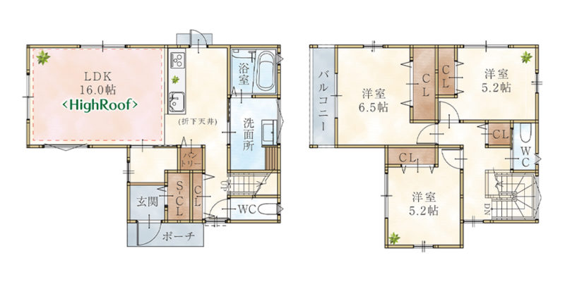 | 間取内容 | LDK16.0畳 1階 洋室6.5畳 2階 洋室5.2畳 2階 洋室5.2畳 2階 | ||
