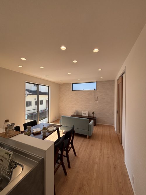 リビングの壁には、落ち着いたグレージュ系のアクセントクロスを採用し