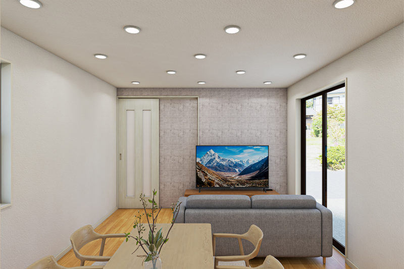 リビングはグレイッシュブラウンのアクセントウォールで落ち着いた印象。