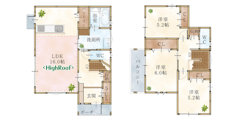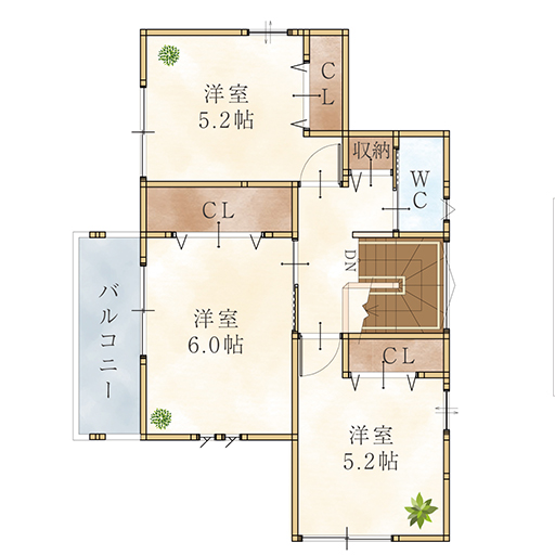 2階には主寝室と洋室が2部屋あり、各部屋にクローゼットがあります。