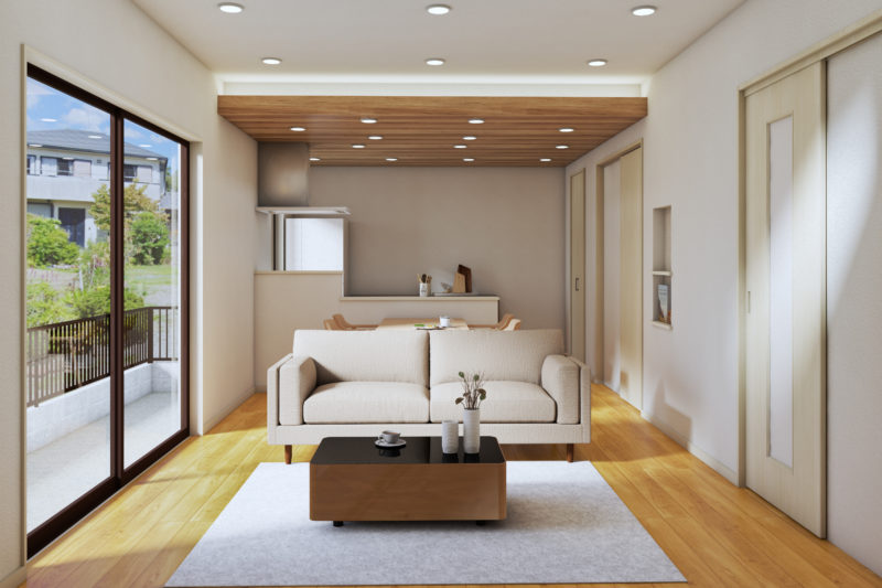 木目の天井とホワイトの扉、豊富な収納が調和した、使いやすくナチュラルなLDKです。