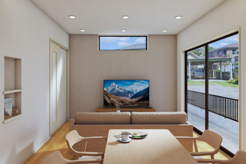 リビングはライトグレーの織物調アクセントクロスを採用し、ナチュラルで温かみのある空間。
