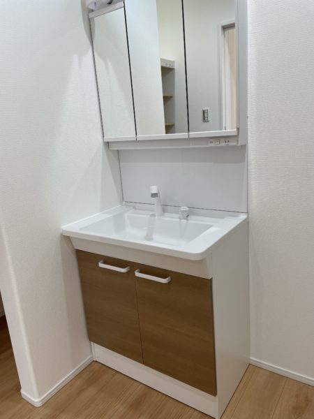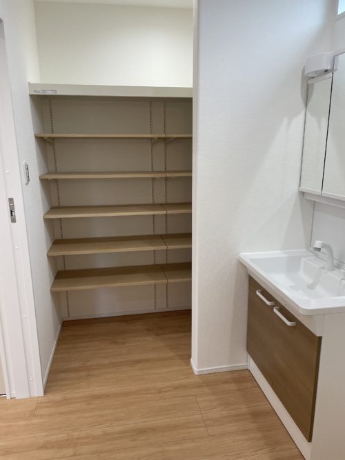 洗面横には広々収納スペースがあるので