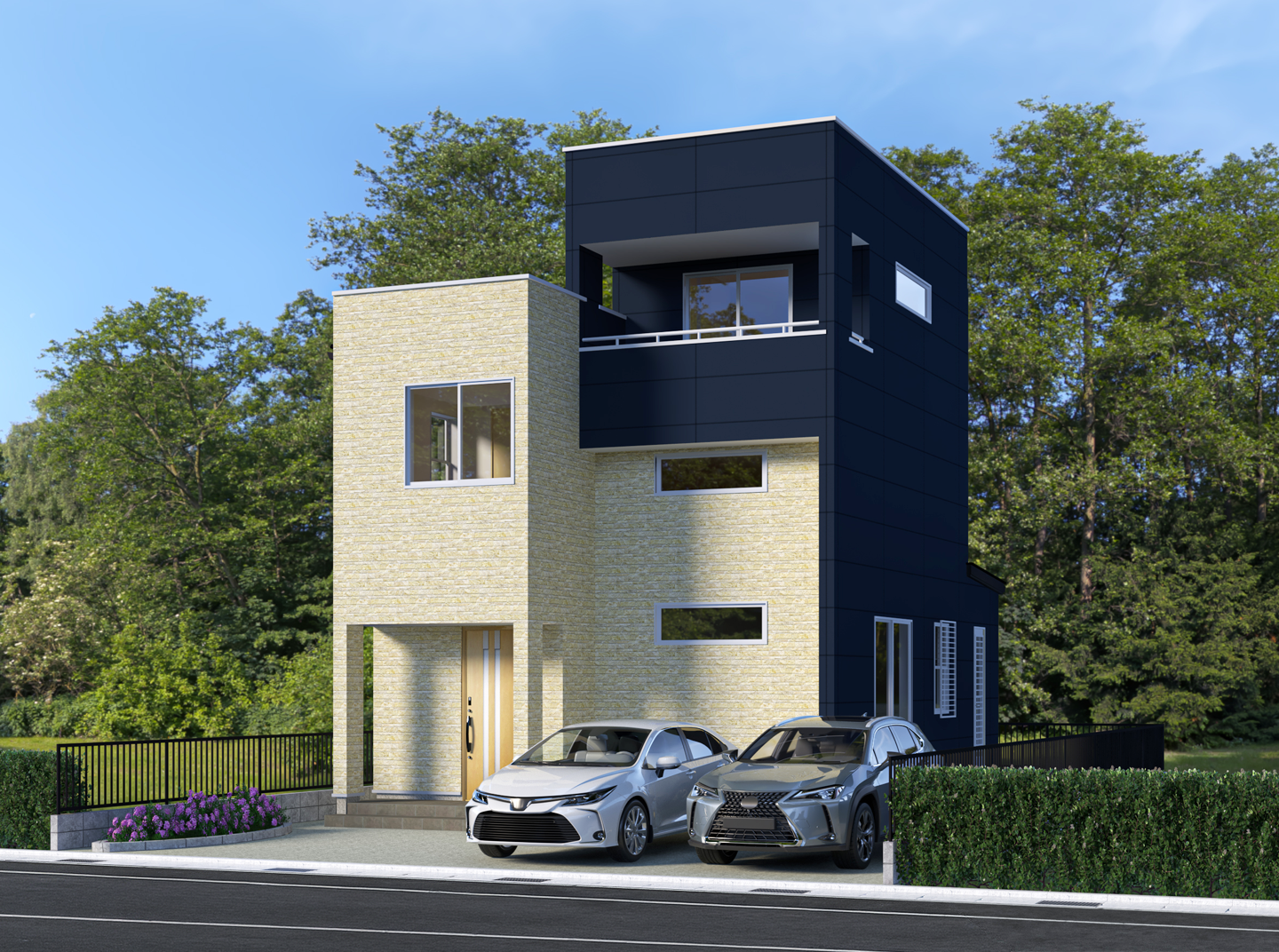 深みのあるネイビーの外壁をベースに、サイディングにはやわらかなベージュを採用。