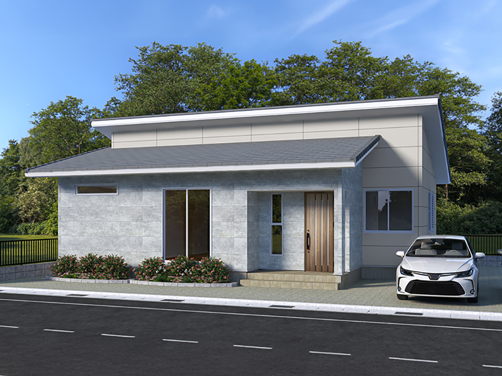 やわらかなアイボリーの外壁をベースに、正面にはライトグレーのサイディングを多く取り入れた