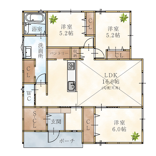 洋室は3部屋あるので、家族それぞれのプライベート空間を確保することができます。