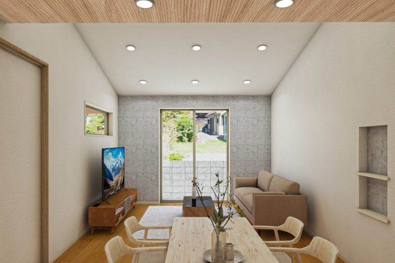 LDKリビングには、ブロック柄のアクセントクロスを採用し、空間にほどよい表情と奥行きをプラス。