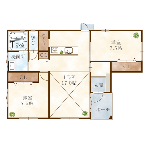 キッチンは家族との会話が自然に生まれる対面式を採用し、パントリーには食品や日用品をすっきり収納可能です。