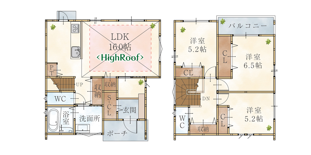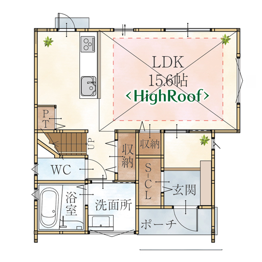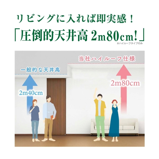 LDKは天井高約2.5mのハイルーフ仕様で、開放感のあるゆとりある空間にです。