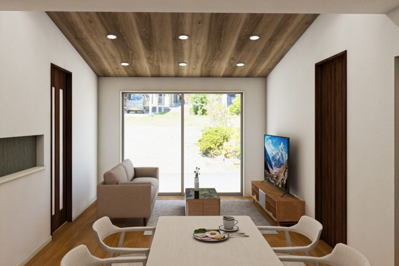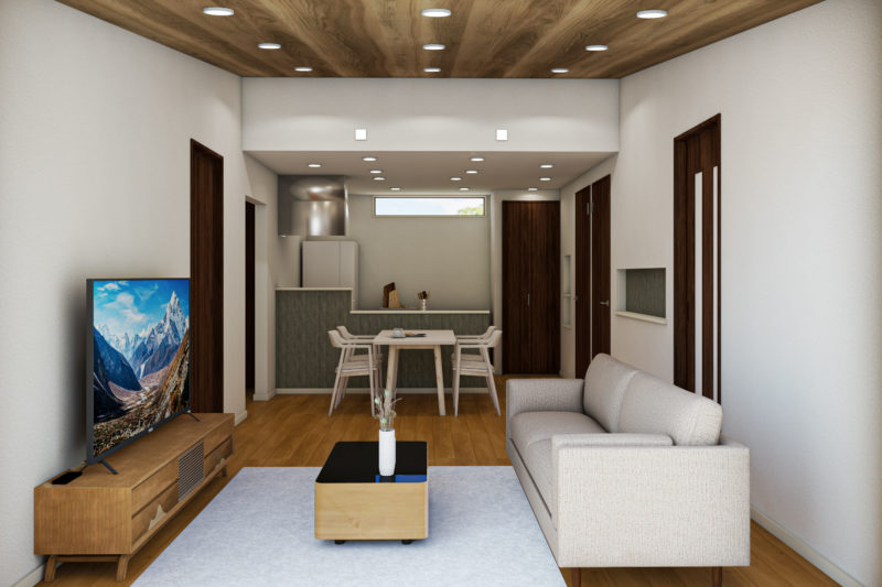 そのまま進むと、開放的なリビングへ。対面キッチンからはリビング全体を見渡すことができ、自然と家族の会話が生まれるつくりです。ふと見上げると、ウッド調の天井がやわらかなぬくもりを添え、空間に心地よさをプラスしています。