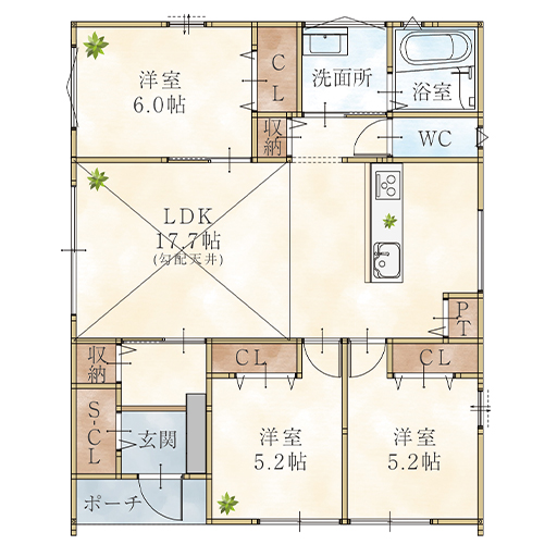 角部屋のクローゼットや廊下収納など、暮らしを支える収納が随所に設けられています。